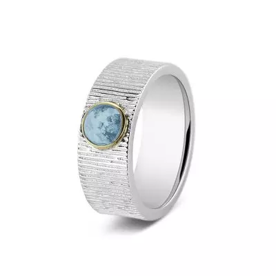 Zilveren ring met 14 krt geelgouden randje.