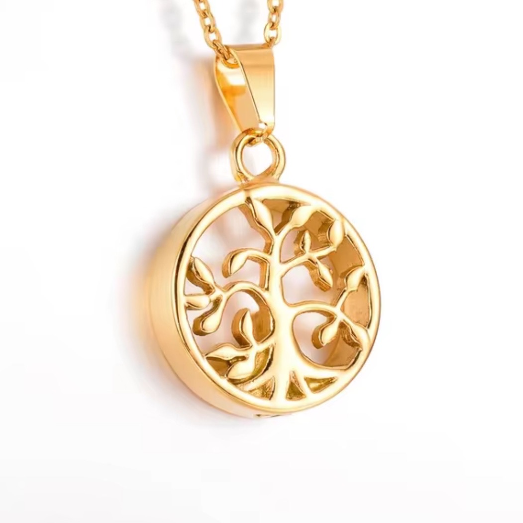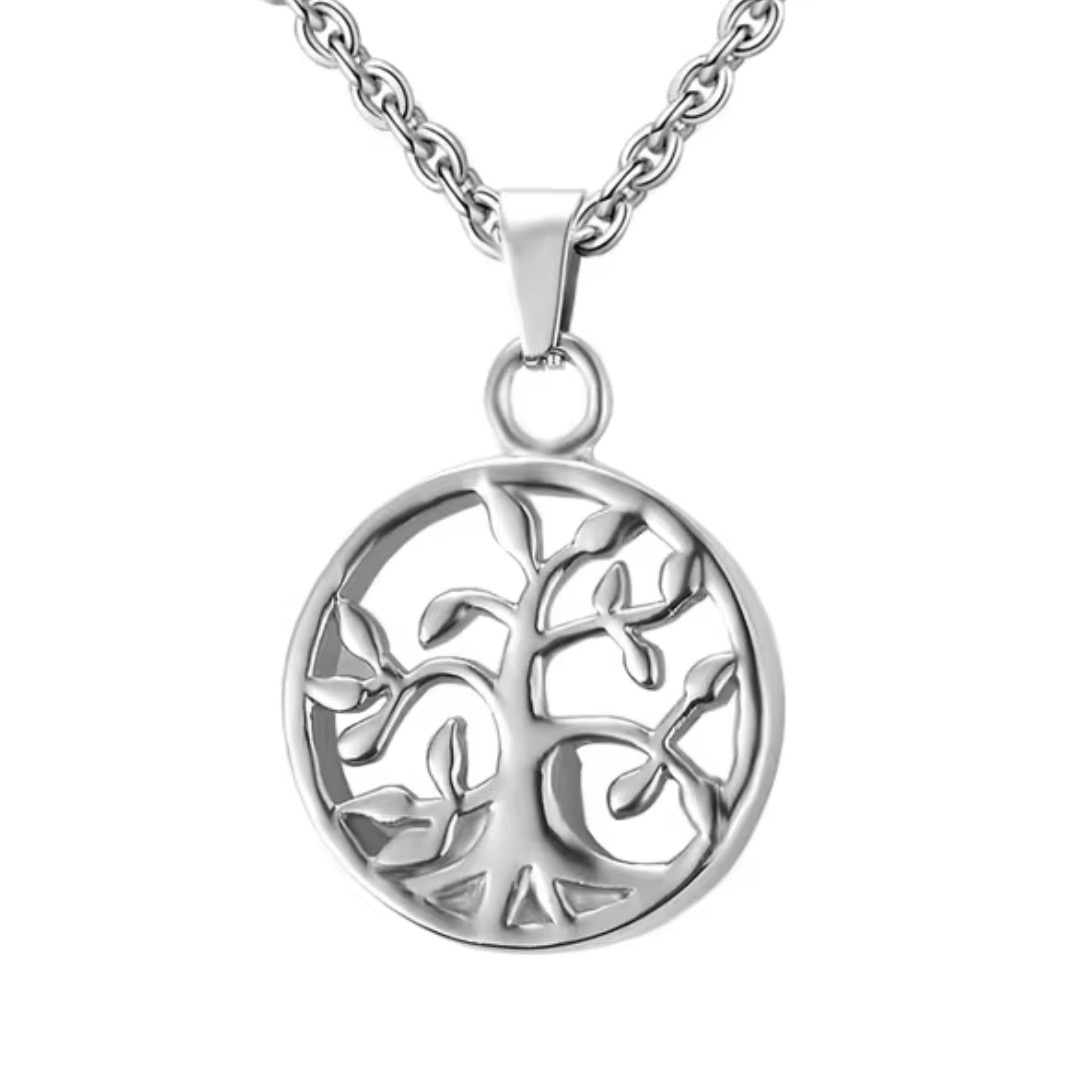 Onze ashanger levensboom vervaardigd uit edelstaal (RVS). Hoewel het dezelfde uitstraling heeft als zilver is edelstaal vanwege de hardheid duurzamer. De ashanger wordt geleverd inclusief collier en vulsetje.