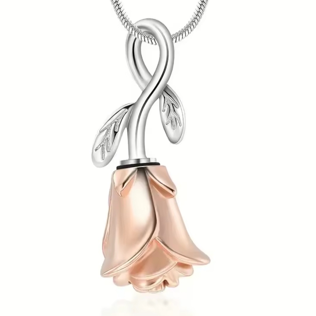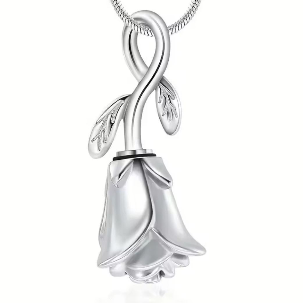 Onze ashanger rosebud is vervaardigd uit edelstaal (RVS). Hoewel het dezelfde uitstraling heeft als zilver is edelstaal vanwege de hardheid duurzamer. De ashanger wordt geleverd inclusief collier en vulsetje.